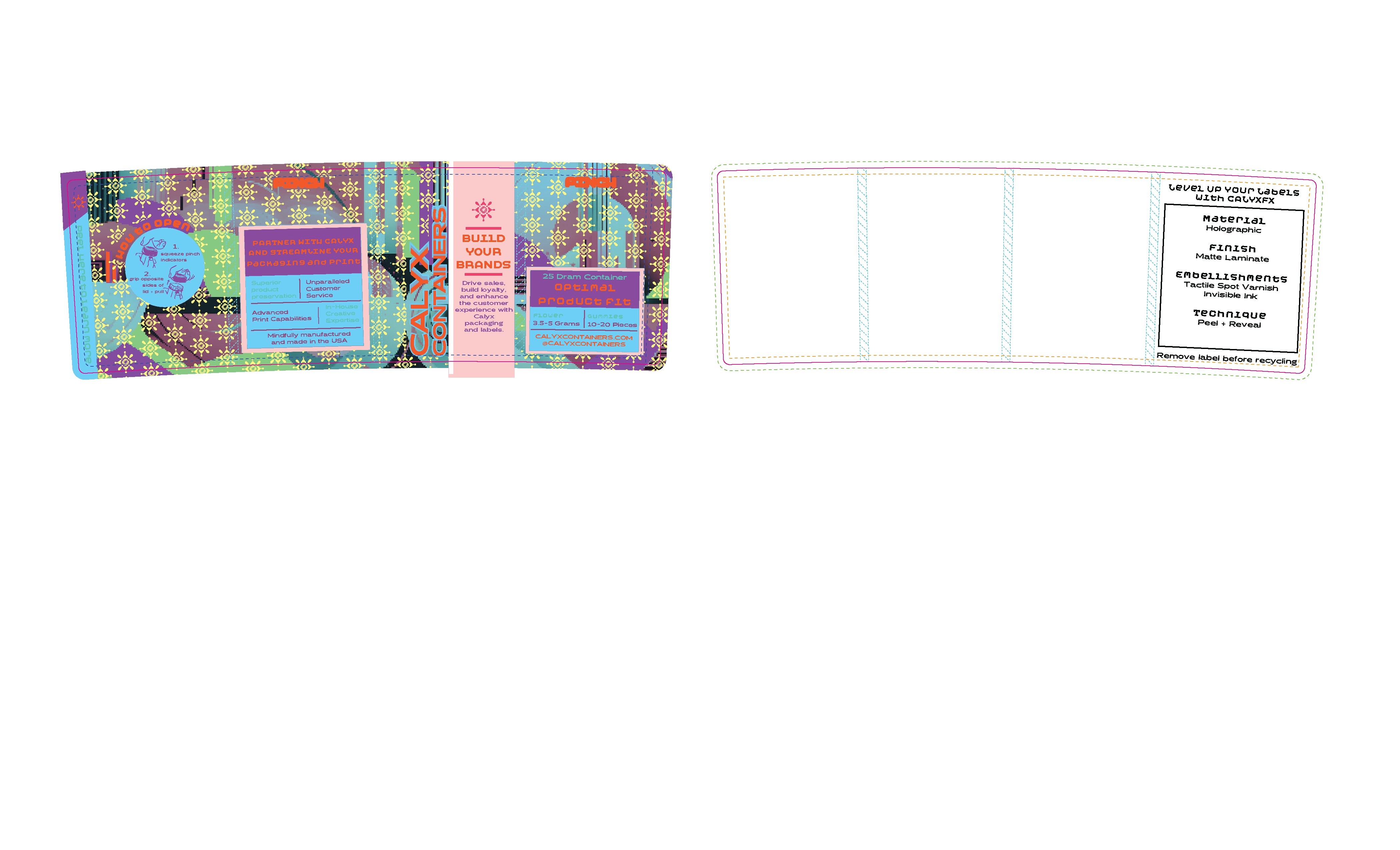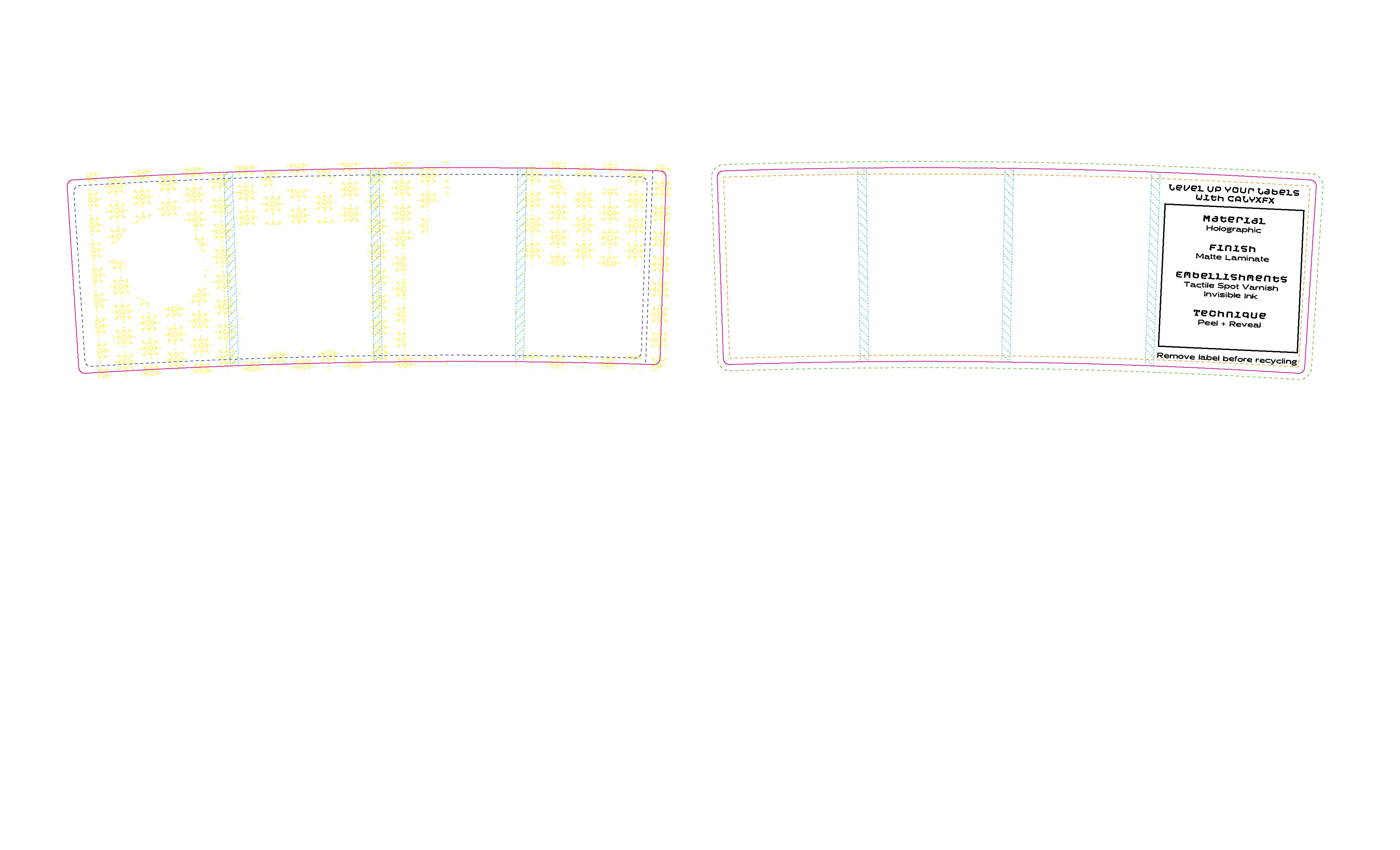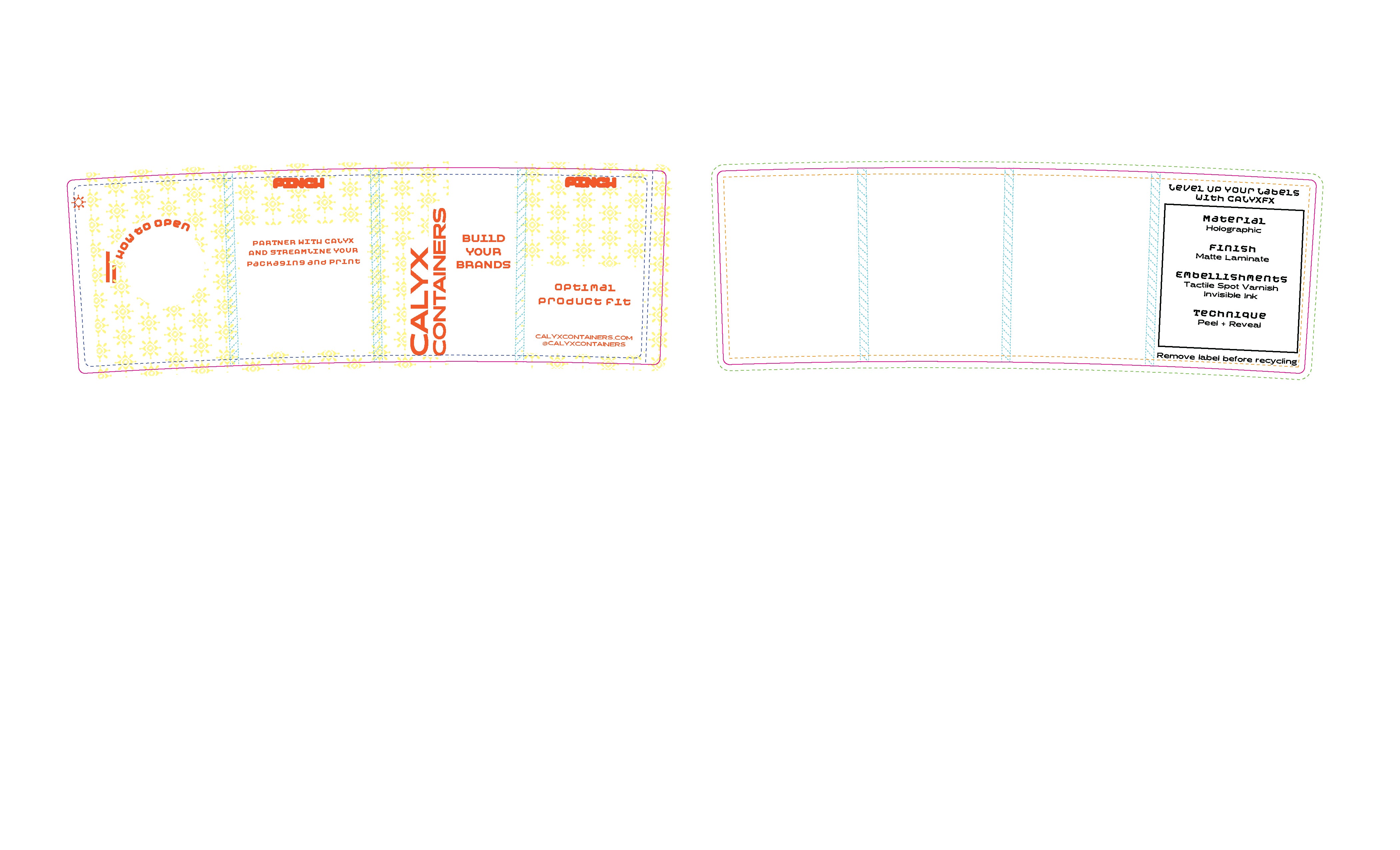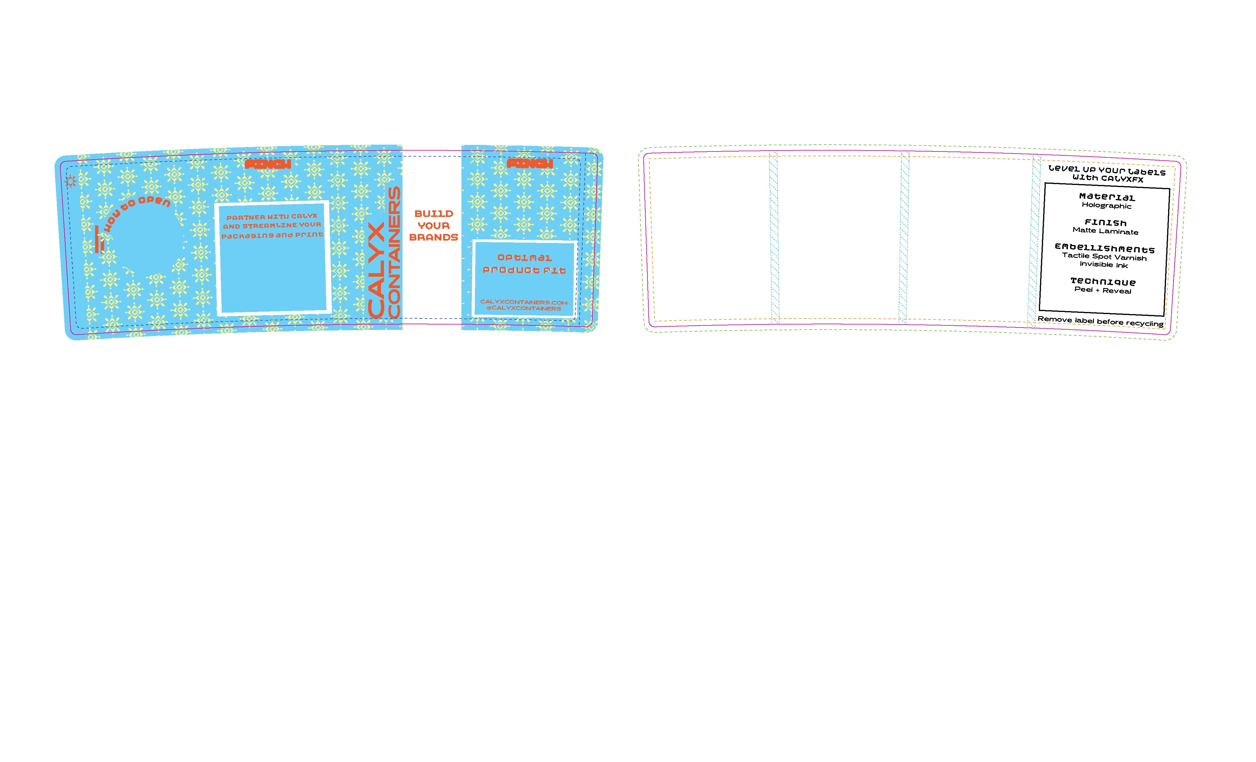 Design within the “Peel + Reveal” layer. Use PnR Pantone 402 C or PnR Black depending on substrate. Place content near the dotted P+R area line.